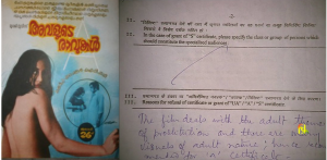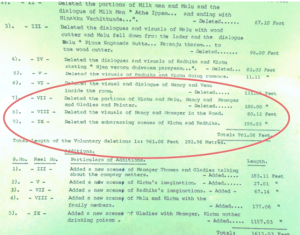 Figure 1.2: Copy of a director’s response to a CBFC censor report of the soft-porn film Nakhachitrangal (Dir. A.T. Joy, 2002). Note the deletion of the “embarrassing scenes” circled in red. Image Courtesy. A.T Joy