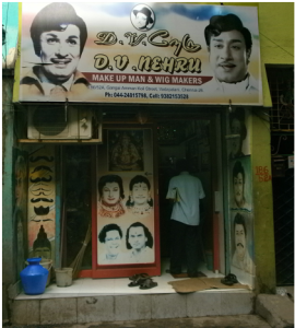 Figure 1: A wig and makeup maker’s shop in Vadapalani, Kodambakkam, featuring the actors Shivaji Ganeshan and M.G. Ramachandran on the signboard