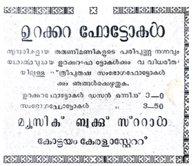 Figure 1.5: Advertisement for “Urakkara Photokal” (Bedroom Photos) that includes naked photos and photos of intercourse by Music Book Stall, Kottayam. Source: Thaniniram Film Entertainment Magazine, Vol.5, No. 11 Aug-Sep 1957, 63.