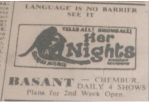 Figure 1.6: A Times of India advertisement for Her Nights in the Bombay edition. Note the text: “Language is no barrier. See it” and the “Tells ALL Shows ALL” in the inset to refer to its pan-Indian appeal. Source: From personal collection, 1978.